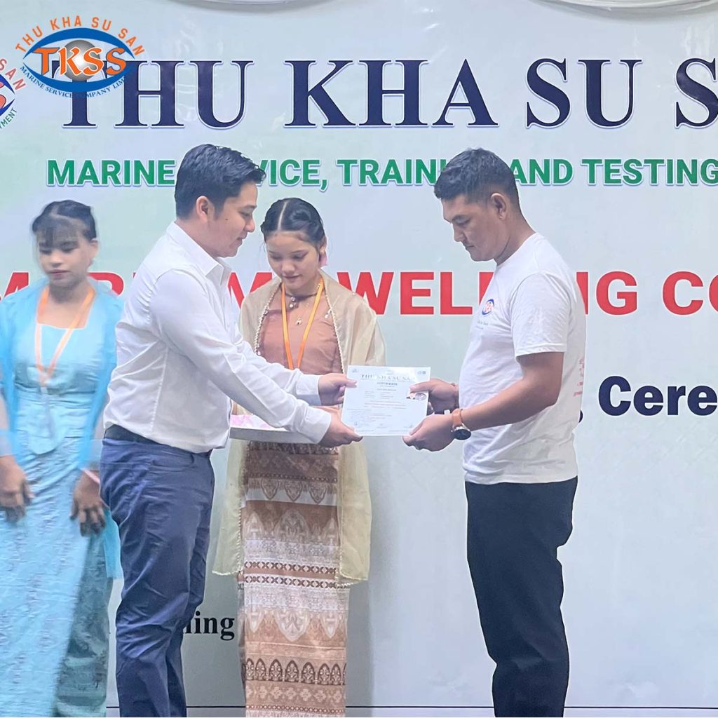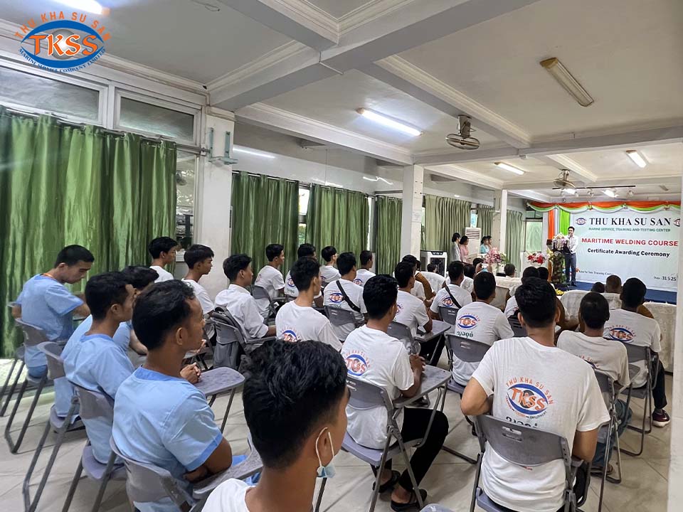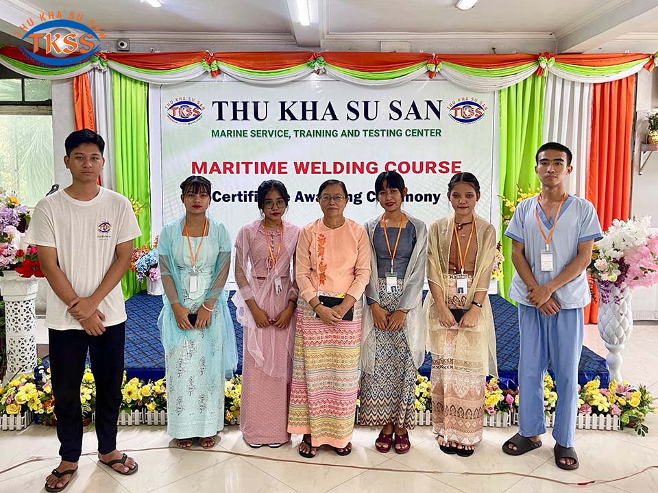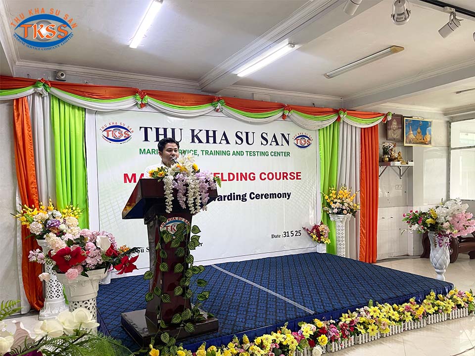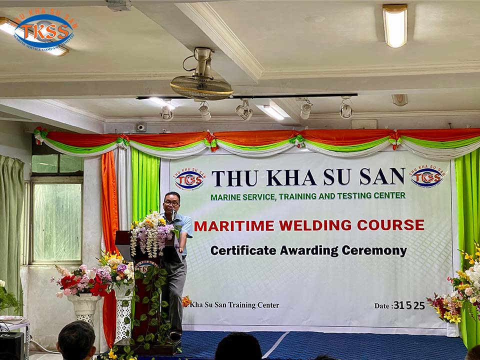 Thu Kha Su San Marine Service မှ ဦးစီးပြုလုပ်သော Maritime Welding Training Course သင်တန်း၏ လက်မှတ်ပေးအပ်ပွဲအခမ်းအနား ကို ၃၁ ရက်နေ့ မေလ ၂၀၂၅ ခုနှစ်တွင် သုခစုစံသင်တန်းကျောင်း၌ အောင်မြင်စွာကျင်းပခဲ့သောပုံရိပ်များဖြစ်ပါသည်ရှင့်။